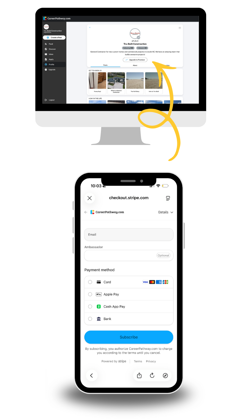 • Navigate to your profile and click "Upgrade to Premium" or the tab on your navigation